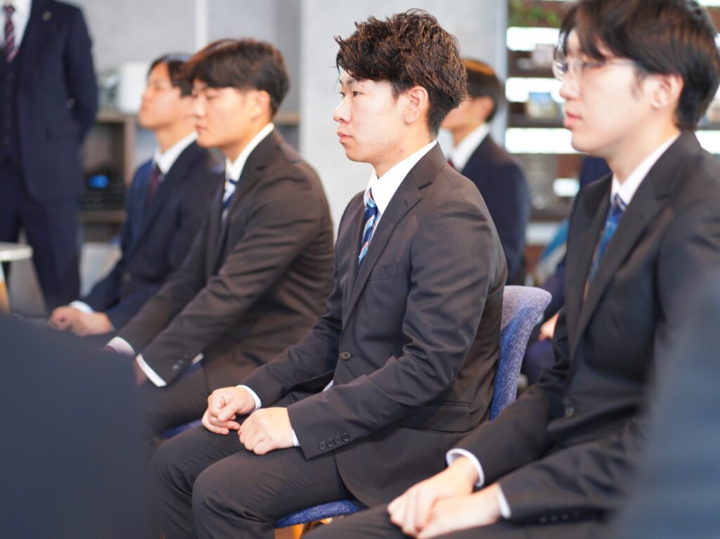 式の中では、会社の理念や今後の成長ビジョンについての話もあり、内定者の皆さんは真剣な眼差しで耳を傾けていました。緊張の中にも、未来への意欲と希望が感じられる時間でした。