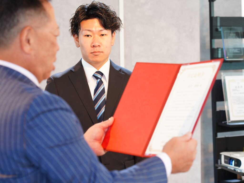 当日は、緊張した面持ちで会場に入る内定者たちを、社長をはじめ先輩社員たちが温かく出迎えました。式典では一人ひとりに内定証書が手渡され、「社会人としての一歩を踏み出す覚悟」と「これから一緒に働く仲間としての期待」が込められた言葉が贈られました。